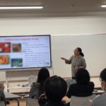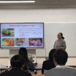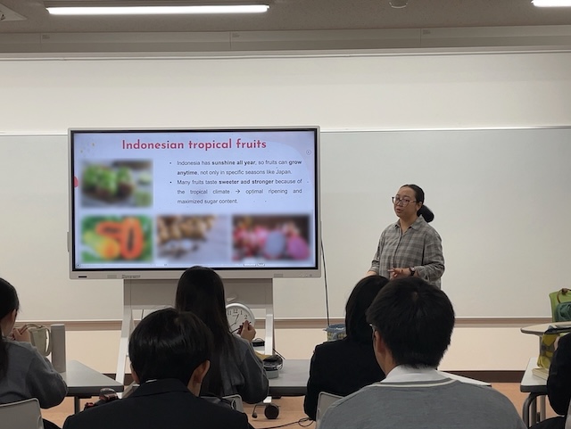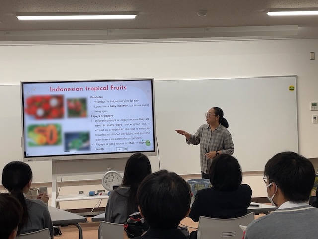今回は、インドネシア出身で愛媛大学に留学しているジェーンさんによる、「インドネシアのトロピカルフルーツ」をテーマとした英語でのプレゼンテーションが行われました。インドネシアは一年中温暖で日差しに恵まれているため、季節を問わず果物が収穫でき、甘くて濃厚な味わいが特徴です。「果物の王様」と呼ばれるドリアンは強いにおいがある一方で、中身はクリーミーで甘く、その香りを心地よいと感じる人もいます。毛に覆われた皮が特徴的なランブータンは見た目がユニークで、味はブドウのように甘みがあります。パパイヤは完熟すれば朝食やジュースとして、未熟なものは料理に、さらに葉まで食用にされます。マンゴーは日本のものより大きく甘く、「果物の女王」と呼ばれるマンゴスティンは甘酸っぱさが魅力です。硬い皮がへびのような見た目のスネークフルーツはリンゴのような食感があり、ドラゴンフルーツは赤い果肉の方がより甘いそうです。また、スイカも一年中手に入り、日本よりずっと安いため、日常的に食べられているとのことでした。果物は朝市や果物トラックでも購入でき、身近な存在であることがよく分かりました。生徒たちからは「ドリアンを試してみたい」「ランブータンの色がかわいい」「インドネシアのマンゴーを食べてみたい」といった感想が寄せられました。なお、スイカが安い理由は、温暖な気候によって収穫量が多いためだそうです。