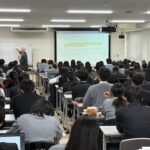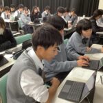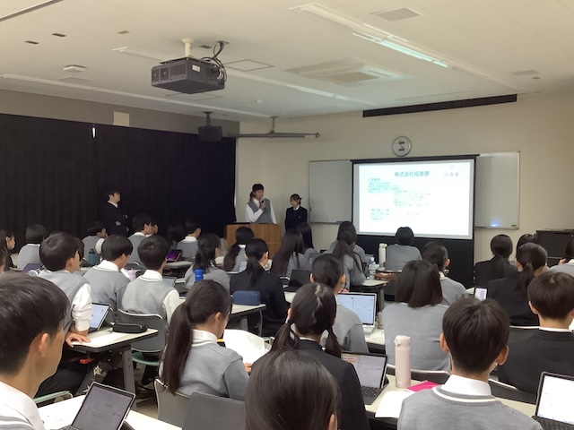 愛媛大学社会共創学部・尾花忠夫先生による「企業と地域のつながり」に関する講義を受講しました。講義の前半では、愛媛県の産業や企業についてクイズ形式で学び、現代の企業には地域貢献活動を通して社会(地域)の発展に寄与することが求められていることを理解しました。後半では、地域とつながる取り組みを行っている企業の事例を調べ、班で共有した内容をスライドにまとめて発表しました。活動を通して、生徒からは「愛媛県に本社がある企業が意外と多いことを知り、驚いた」「企業のロゴやシンボルマークには理念が込められていることが分かって興味深かった」「先生がお話しされていたように、社会の変化に対応し、課題を解決できる人材になりたい」といった感想が寄せられました。尾花先生、本日はお忙しい中ご講義いただき、誠にありがとうございました。