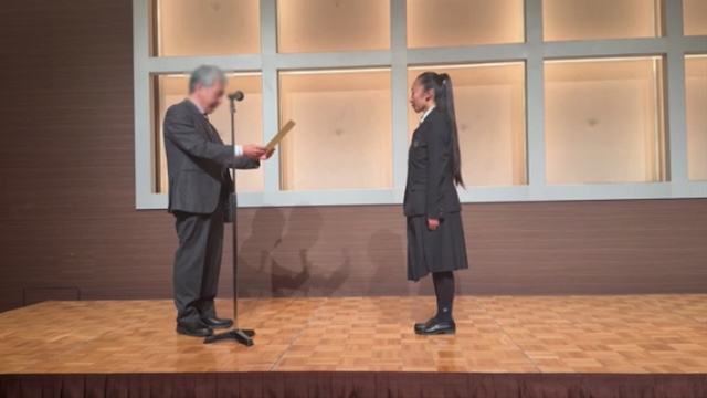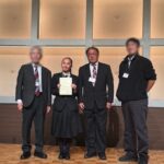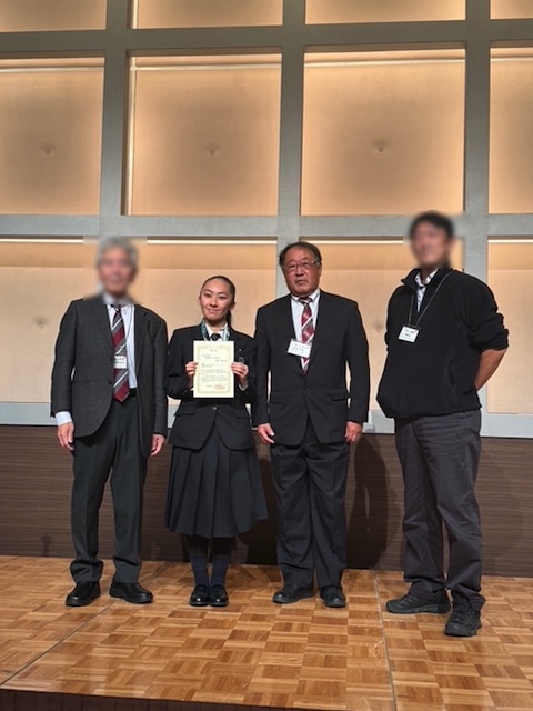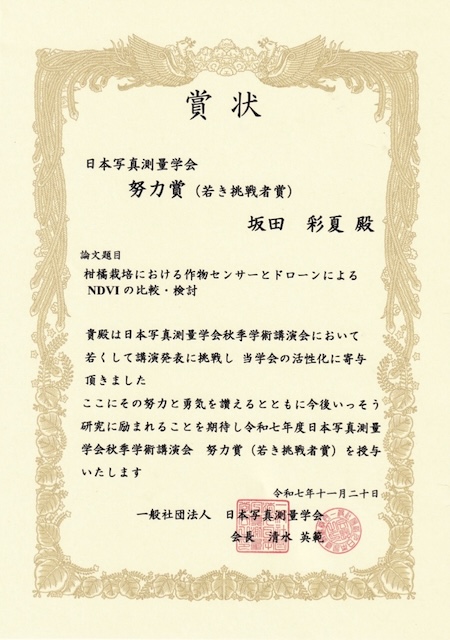 坂田さんが山形市で開催された令和7年度日本写真測量学会・秋季学術講演会で、「柑橘栽培における作物センサーとドローンによるNDVIの比較・研究」の論文発表をしました。この論文は、2年生の高大連携授業「課題研究Ⅰ」を継続発展させた「課題研究Ⅱ」の内容で、60余年の歴史がある日本写真測量学会での高校生の発表は初めてで、技術交流会において、日本写真測量学会会長 清水英範様より努力賞の表彰を受けました。高校生の論文発表の機会を与えていただいた日本写真測量学会に対して深く感謝申し上げます。