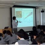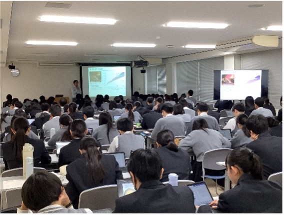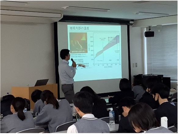 愛媛大学地球深部ダイナミクス研究センターより境先生をお招きし、高圧力についてお話をしていただきました。まず、圧力とは何かについて説明をいただき、「超高圧力の世界」である惑星の内部環境を再現するという高圧実験の目的をご紹介いただきました。高温・高圧下では、気体を固体にしたり、ある固体を性質の異なる別の固体へと変化させたりすることが可能であり、地球や他の惑星の研究、さらには過去や未来の惑星進化の解明にもつながることに大変驚かされました。また、高圧力によって物質を縮ませたり電子状態を変化させたりできることから、惑星研究における高圧実験が大きな可能性を秘めていることも理解できました。全体の内容は非常に専門的で難しいものでしたが、境先生の研究に対する熱い思いが伝わり、大学での学びの奥深さを実感するとともに、興味をかき立てられる貴重な時間となりました。