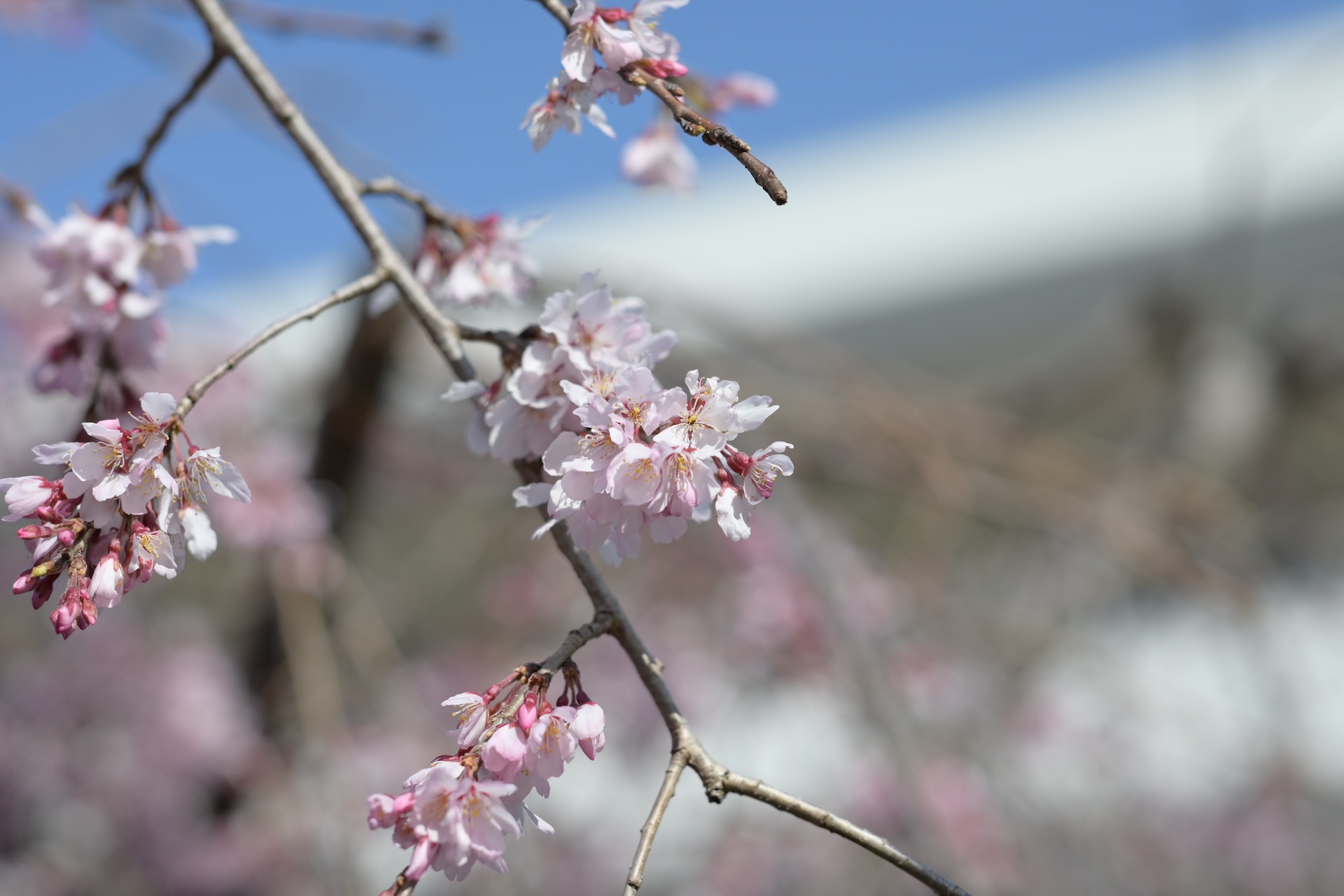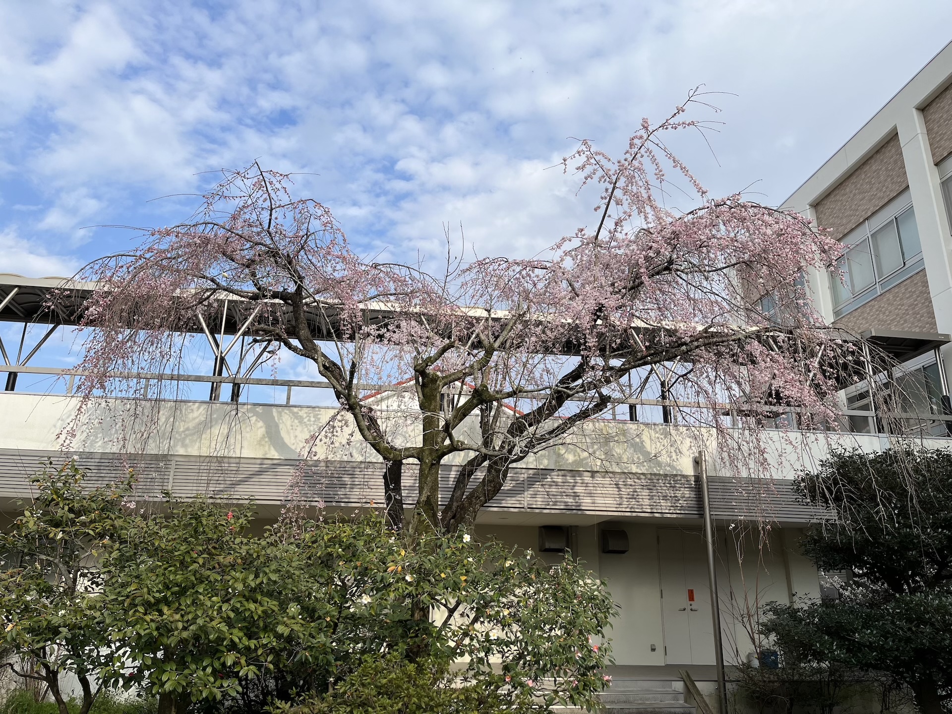 附属高校で一番に春を告げる、1・2棟間の枝垂れ桜が満開です。 枝垂れ桜は、枝が垂れ下がる特徴があり、ソメイヨシノとは一味違う美しさがあります。枝いっぱいに花を咲かせています。