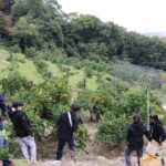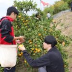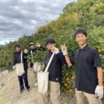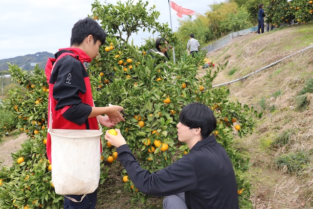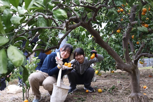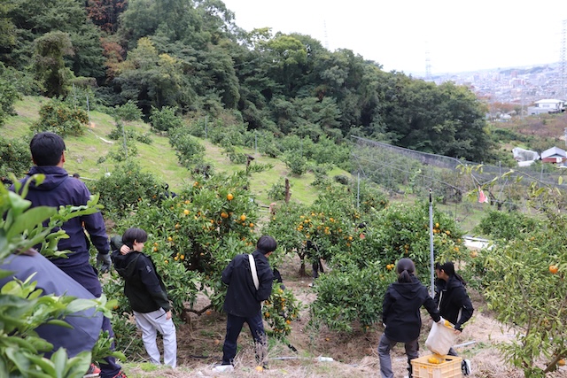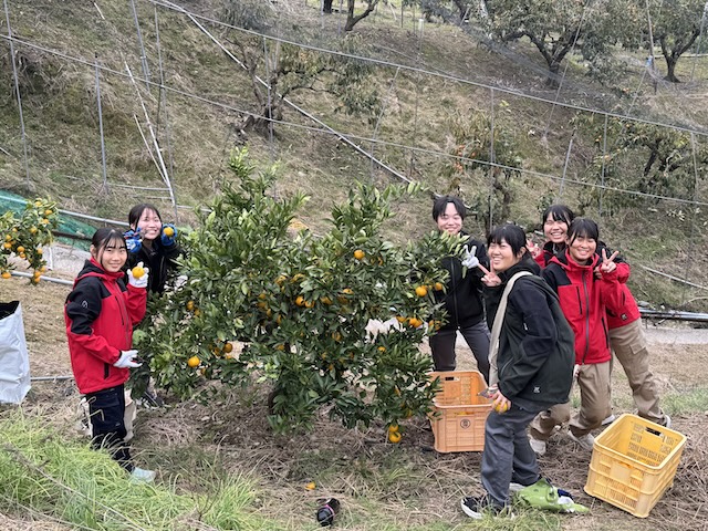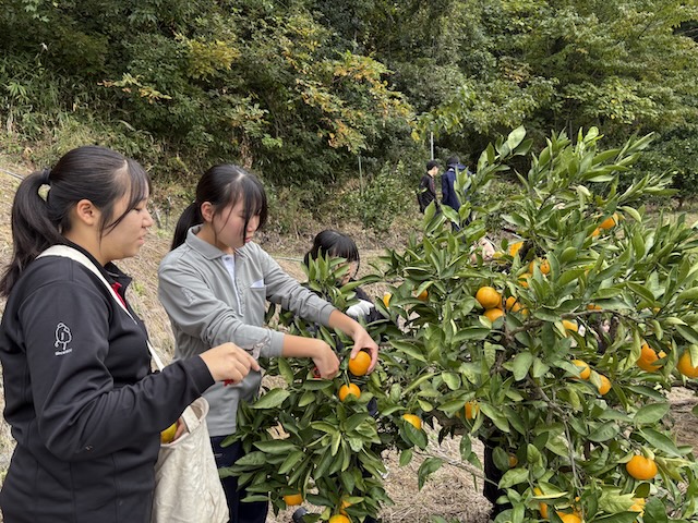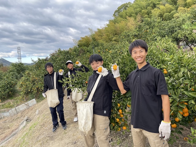 農業科目の授業で果樹を担当した生徒が、4月から宮川早生を大切に栽培してきました。その宮川早生が収穫期を迎えたため、1年生全員と授業体験に来ていただいた保護者の方々が収穫実習を行いました。当日は、畑寺果樹園まで徒歩で30分かけて移動し、急斜面を登って収穫に取り組みました。今年は表年ということもあり、木には多くのみかんが実っており、生徒たちは「パチ・パチ・ポン」の掛け声を唱えながら、手際よく収穫を進めていました。キャリー90ケース分のみかんを収穫し、全員が大きな笑顔を見せてくれました。実習後の試食でも生徒たちは大喜びで、みかんのおいしさを味わいながら、本日の実習をしっかりと記憶に焼き付けてくれたことと思います。