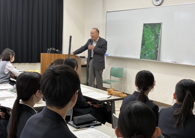 「グローバル・スタディーズⅠ」の授業において、愛媛大学国際連携機構の小林修先生にご講演いただきました。前半は、「おさむちゃんの半世紀+8年」と題し、小林先生がこれまでに経験されてきた出来事についてお話しいただきました。日本の人口が1億に達しようとしていた1968年の新聞記事や、固定為替相場制のもとで1ドル=360円であった時代など、約50年前の日本の様子ついて、生徒たちは興味深く耳を傾けていました。ユーモアを交えた語り口と内容により、生徒たちの笑い声が絶えない講演となりました。後半は、グループ活動を行いました。模造紙に世界地図を描き、配布されたプリントに記載されている衣類や缶ジュースといった製品について、その原材料がどこで生産され、どのような経路を経て日本に届くのかを考察しました。生徒たちは普段あまり意識することのない内容に戸惑いながらも、グループの仲間と議論を重ね、理解を深めていきました。非常に有意義な時間となりました。