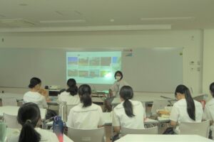 今回の話題は「近くのおすすめの場所・お店」です。インドネシアからの留学生は「道後」について紹介し、ミャンマーからの留学生は行きつけの飲食店や近所のスーパー、よく行く公園について紹介しました。生徒は留学生にそれぞれのおすすめの場所を紹介するなど、楽しく会話が弾んでいました。
